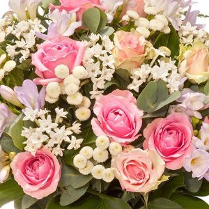 Le bouquet Rencontre est un bouquet rond composé de fleurs dans les tons rose pâle, parme et blanc. Il est composé de roses, freesias, matricaires et feuillages soigneusement sélectionnés pour leur beauté et leur fraîcheur.