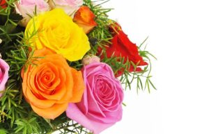 Les roses aux gros boutons multicolores, dans les tons rouges, orange, rose et jaunes, apporteront une touche de gaieté et de diversité à cette création florale. À l’intérieur comme à l’extérieur, du branchage d’asparagus viendra donner du volume et de la légèreté au bouquet.