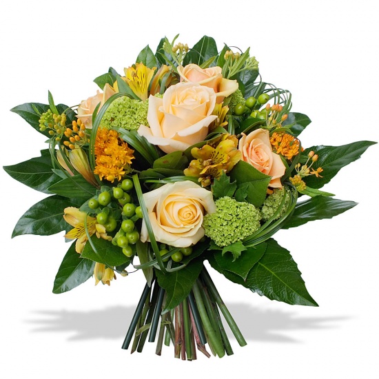Ce tendre bouquet rond est composé de magnifiques roses et fleurs de saison aux tons orangés et jaunes. Il est également agrémenté de délicates fleurettes et de feuillages verts variés pour une touche de fraîcheur.