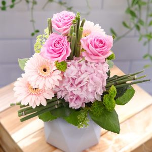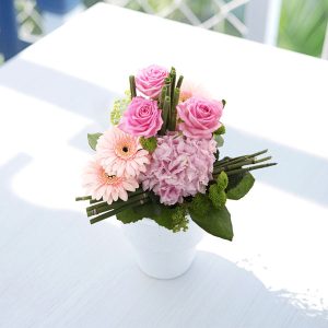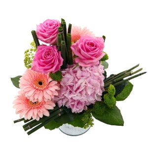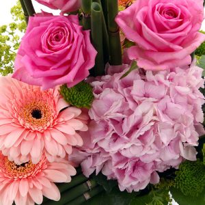 Des roses, gerberas, hortensias et fleurettes accompagnés de feuillage