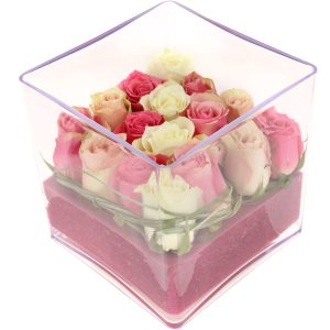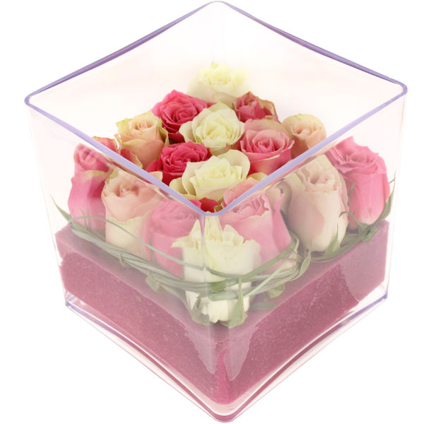 Cette composition piquée est réalisée avec soin à partir de mousse rose et de 16 roses pastel, soigneusement disposées dans un contenant carré en plexiglass. Un travail de feuillage vient sublimer le bouquet pour une touche de fraîcheur et de raffinement.