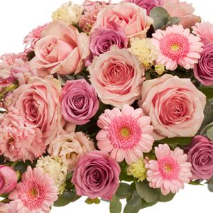 Exprimez vos plus tendres regrets avec cette belle gerbe de fleurs dans les tons de rose avec une pointe de mauve. Nos artisans fleuristes ont choisi avec soin des roses roses et mauves, des germinis roses, des mufliers, des lysianthus, du salal et de l’eucalyptus pour créer un bouquet résolument féminin et apaisant.