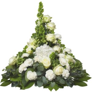 Ce coussin conique de fleurs est une création majestueuse qui saura transmettre vos messages de condoléances avec élégance. Assemblées en hauteur dans des tons blancs et verts, cette composition est réalisée avec de belles roses et des fleurs de saison, agrémentées de feuillages délicats par un artisan fleuriste expert de 123 fleurs.