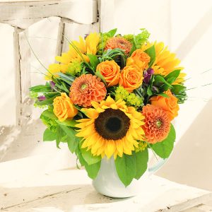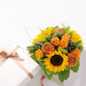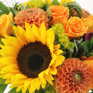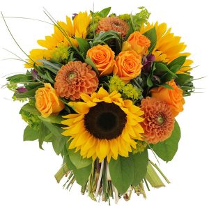 Ce bouquet est composé de tournesols, de roses, de dahlias et d’autres fleurs de saison dans des tons jaune et orange, avec une pointe de rose pâle pour apporter de la douceur et de la fraîcheur. Offrez ce bouquet ensoleillé pour faire entrer le soleil dans le cœur de vos proches.