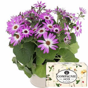 Offrez-vous ou offrez à votre destinataire cette association parfaite entre la nature et la gourmandise avec ce duo harmonieux. D’un côté, le Cinéraire Senetti dans son pot en zinc de couleur taupe, avec sa beauté éclatante qui saura égayer vos journées. De l’autre, un coffret de thé de la marque Compagnie & Co comprenant deux mélanges aux saveurs exquises : thé vert menthe rafraîchissant et mélange fraise basilic.