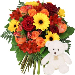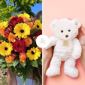 Ce bouquet est accompagné de son ourson en peluche, qui peut varier selon le fleuriste en charge de la livraison de votre commande. Une attention supplémentaire qui fera plaisir à coup sûr !