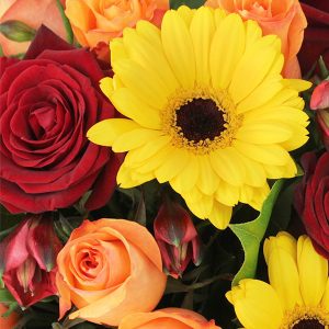 Ce bouquet est composé de roses, germinis et autres fleurettes de saison dans des tons rouge, orange et jaune. Ces fleurs apportent une touche de gaieté et de fraîcheur à l’ensemble de la composition. Un véritable régal pour les yeux !