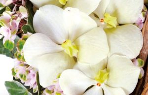 Choisir une gerbe de fleurs ou un bouquet de fleurs pour un deuil est toujours délicat. Nous travaillons avec des artisans fleuristes qui ont une grande connaissance technique de l’art floral pour vous proposer des compositions travaillées avec sobriété et élégance. C’est le cas de ce cœur de fleurs spécialement conçu pour un deuil, en forme de petit cœur dans les tons blanc et vert avec de légères nuances rosées. Il est composé de santinis, de rosettes branchues blanches et de magnifiques orchidées Wanda blanches dans une réalisation serrée. Des fagots de bois et du lierre apportent de la finesse à l’ensemble dont la surface couvre 30 cm environ (en formule standard). Les orchidées selon la saison pourront être remplacées par une autre variété de fleurs comme des têtes d’hortensias blancs.