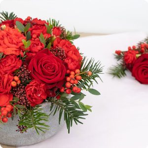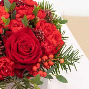 Cet arrangement en fleurs dans les tons de rouge, couleur emblématique de la fin d’année, est un véritable régal pour les yeux. Composé de roses rouges élégantes, d’œillets ravissants et de sapin pour une touche chaleureuse, cette création florale est parfaite pour offrir, embellir votre intérieur ou encore décorer vos tables de Noël et de fêtes.