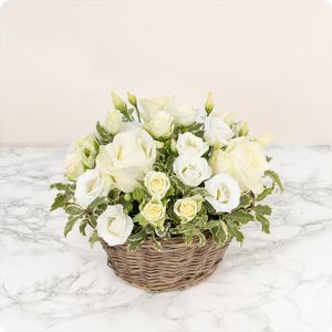L’arrangement floral pour deuil “Colombe” est une composition délicate composée de roses blanches et de petites fleurs de saison, agrémentée d’un feuillage finement sélectionné. Cette création florale apportera un message de soutien et de condoléances avec douceur et élégance. Sa taille approximative de 20/25cm de diamètre en fait un choix “classique” idéal.
