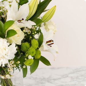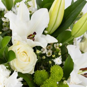 Ce bouquet pour deuil, nommé Compassion, est un assemblage de majestueux lys, d’élégantes roses et de délicates fleurs de saison dans les tons blancs et verts. Avec ses fleurs lumineuses, cette création florale raffinée apportera élégance et réconfort à vos messages de condoléances.
