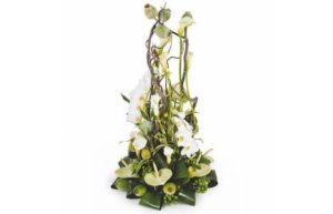 Cette composition de fleurs en hauteur est réalisée avec soin par un artisan fleuriste. Elle se compose de splendides anthuriums verts ou blancs, de phalaenopsis (plus connues sous le nom d’orchidées), d’ornithogalum, d’hypéricum et de callas blancs pour apporter de la hauteur. Des feuillages tels que la cordyline, les feuilles d’aspidistra et de dracaena viennent compléter cet ensemble floral.