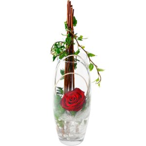 Votre cadeau de rose est présenté et livré à domicile dans son vase transparent, agrémenté de décos naturelles et feuillages délicats pour une composition florale élégante.