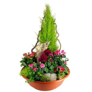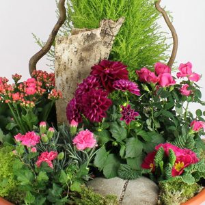 Cette composition de plantes est composée d’un cyprès, de dahlias et de plantes vertes et fleuries dans des tons de rose et de vert. Le contenant peut varier en fonction des disponibilités et les plantes peuvent être adaptées en fonction des saisons.
