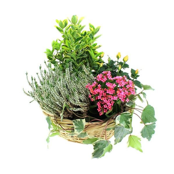 Le petit rosier, le fusain et les plantes vertes et fleuries sont disposés avec soin dans un panier, qui peut varier en fonction des disponibilités chez le fleuriste. Cette composition délicate saura vous accompagner dans les moments de gratitude et de souvenirs qui jalonnent la vie.