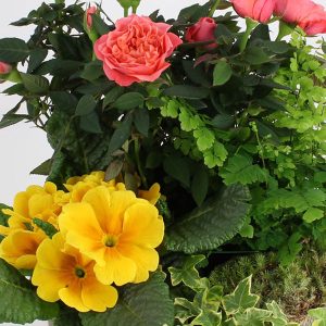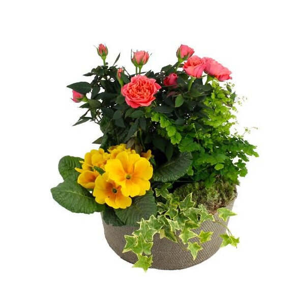 Ce bouquet de plantes est composé d’un rosier, d’une primevère et de plantes vertes dans des tons de jaune, rose et vert. Le contenant, de forme ronde, peut varier en fonction des disponibilités mais restera dans les teintes beige et marron.