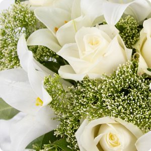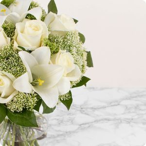 Ce magnifique bouquet de deuil dans les tons blancs est composé de roses et de lys aérés, agrémentés de délicats végétaux. Il est idéal pour accompagner élégamment vos messages de condoléances et apporter un peu de lumière dans ce moment difficile.