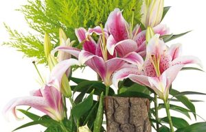 Cette composition comprend un cyprès vert clair ou un autre conifère, un lilium ou un lys rose, un mini rosier blanc, trois primevères de couleurs différentes, un cyclamen fuchsia, un pied de chrysanthème jaune, le tout agrémenté d’écorce de pin et de mousse des bois.