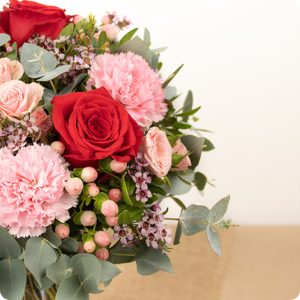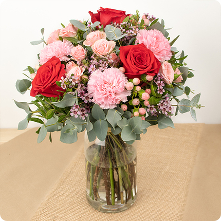 Ce généreux bouquet, aux teintes rouges et roses, est orné de feuillage d’eucalyptus et travaillé dans un esprit naturel. Cette création élégante associe de belles roses rouges avec de jolies fleurs de saison raffinées, pour une déclaration qui exprime vos plus beaux sentiments.