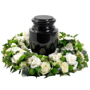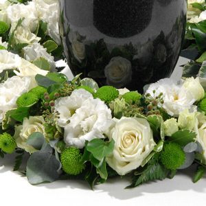 Apportez une touche de douceur et de sérénité à vos hommages avec cette couronne pour urne de deuil. Composée de roses, de lysianthus et de feuillage dans des tons blanc et vert, elle symbolise à la fois l’amour et la paix.