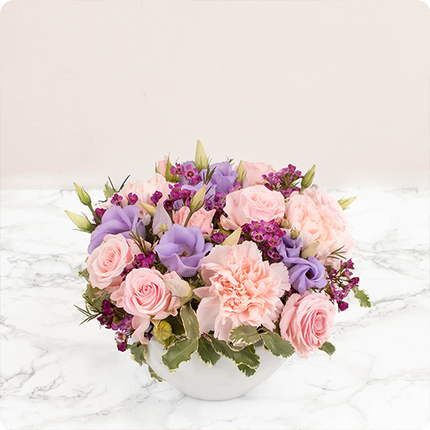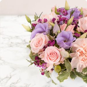 Cette composition florale raffinée est composée de roses roses et de fleurs de saison violettes. La combinaison de ces deux couleurs évoque la tendresse, l’affection et le respect, pour un hommage empreint de douceur et de délicatesse.