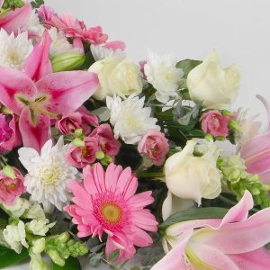 Offrez un bouquet de fleurs unique avec cette gerbe piquée dans les tons blanc et rose. Composée de lys, de roses, d’œillets et d’autres fleurs de saison, elle apportera une touche de fraîcheur à votre intérieur. Le tout est accompagné de feuillage pour une composition harmonieuse.