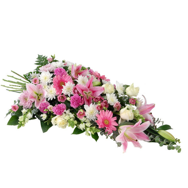 Offrez un bouquet de fleurs unique avec cette gerbe piquée dans les tons blanc et rose. Composée de lys, de roses, d’œillets et d’autres fleurs de saison, elle apportera une touche de fraîcheur à votre intérieur. Le tout est accompagné de feuillage pour une composition harmonieuse.