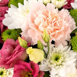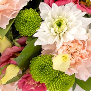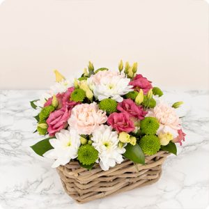 Cette création florale délicate est composée de fleurs de saison dans des tons roses, blancs et verts, sublimées par un léger feuillage. Elle est présentée dans une élégante vannerie et mesure environ 18/20cm de largeur. Parfaite pour exprimer vos condoléances avec douceur et délicatesse.