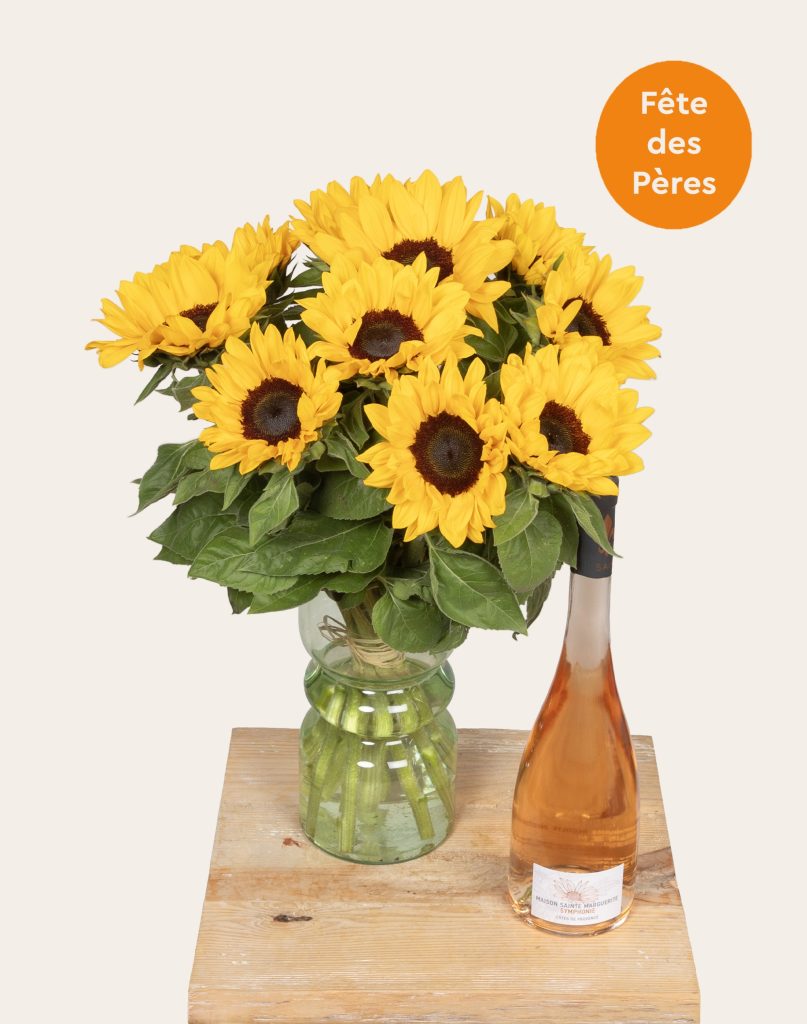 Offrez un cadeau alliant beauté et plaisir avec ce duo composé d’une botte de 10 tournesols cultivés en Île-de-France et d’une bouteille de rosé MAISON SAINTE MARGUERITE – Symphonie 75cl.