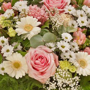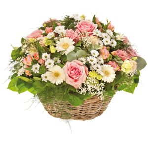 Cette composition de deuil est composée de roses roses clair, d’alstromérias, de germinis blancs, de lysianthus et d’autres fleurs dans un panier en osier sans anse (contenant non contractuel). Elle est idéale pour rendre hommage à un être cher dans la douceur et la sobriété.