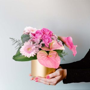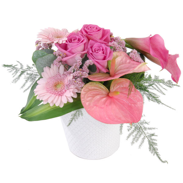 Cette composition piquée est composée de roses, d’anthuriums, de germinis et d’autres fleurs de saison, le tout dans un contenant. Le choix du contenant peut varier en fonction des disponibilités du fleuriste en charge de votre commande.