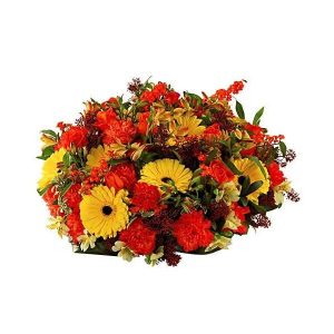 Ce coussin rond est composé d’œillets, germinis, roses et autres fleurs dans des tons rouges, orange et jaunes. Un bouquet coloré pour rendre hommage au défunt.