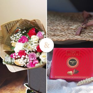Un bouquet de roses pastel accompagné de délicieux chocolats