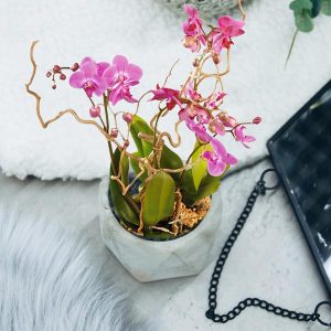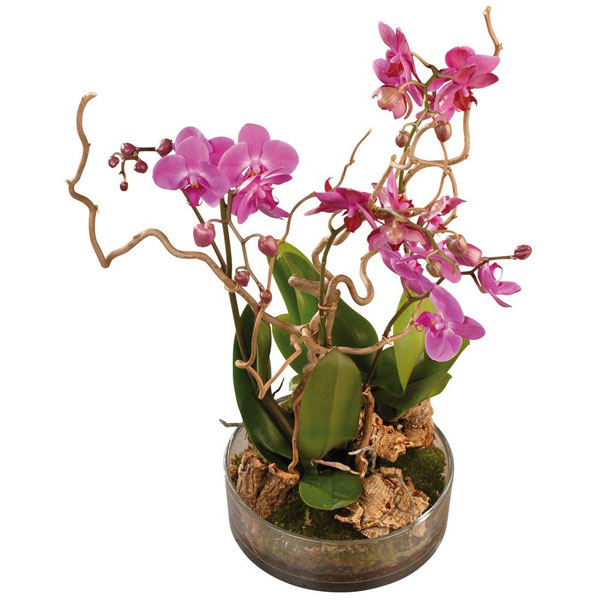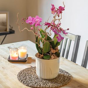 Cette orchidée phalaenopsis est mise en valeur par les branches de corylus tortueux, créant une composition à la fois élégante et sauvage. Son entretien est facile, mais son emplacement doit être choisi avec soin. Elle préfère une température entre 18 et 21°, dans un endroit lumineux sans soleil direct. En été, elle peut également être placée à l’extérieur. Arrosez-la régulièrement, mais sans excès.