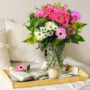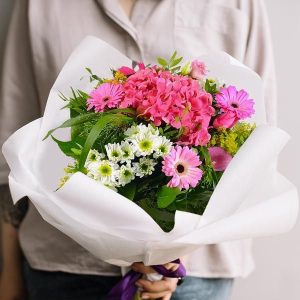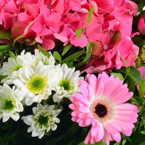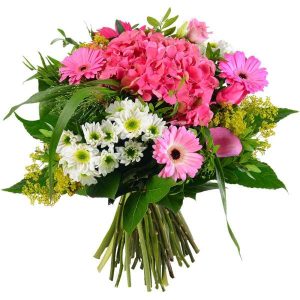 Ce bouquet ravira les yeux et les papilles avec ses couleurs éclatantes et sa composition florale variée. Les germinis, les hortensias, les roses et d’autres fleurettes de saison se mélangent dans un tourbillon de couleurs estivales. Un véritable bonheur pour les sens !