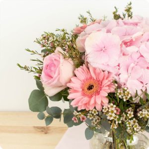 Composé de délicates fleurs dans les tons roses, Idylle est un bouquet à la fois doux et élégant. Ses hortensias, avec leurs généreuses têtes de fleurs denses, créent un magnifique contraste avec ses roses plus délicates et ses petites fleurs de saison.
