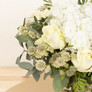 Composé de majestueux hortensias, de superbes roses et de délicates fleurs de saison blanches, le bouquet Jardin pur allie simplicité et élégance. Idéal pour apporter une touche de tendresse et de douceur à n’importe quel intérieur, que ce soit pour une occasion spéciale ou simplement pour faire plaisir à un être cher.