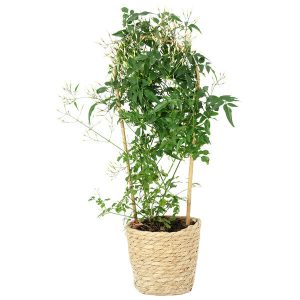 Le jasmin est présenté dans un pot en osier, ce qui lui donne un aspect élégant et naturel.