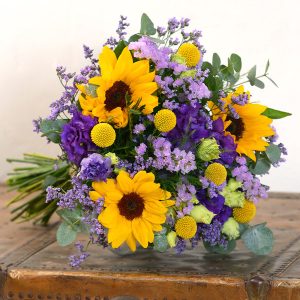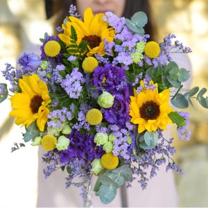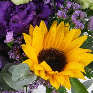 Notre bouquet se compose de tournesols, de lisianthus, de limonium, de fleurettes et de feuillage, dans des nuances de violet et de jaune. Un mélange harmonieux qui évoque la nature et la gaieté de l’été.