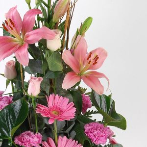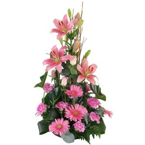 Ce devant de tombe dans les tons roses est un magnifique arrangement floral composé d’un mélange de lys, gerberas, roses et autres fleurs de saison. Le tout est soigneusement piqué dans de la mousse avec du feuillage pour un effet naturel et élégant.