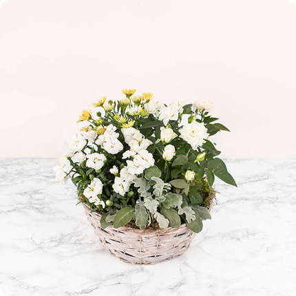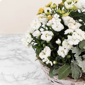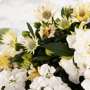 Cette composition pour deuil, d’une taille approximative de 20/25cm de diamètre, est un assemblage délicat de plantes fleuries aux teintes blanches et de végétaux raffinés. Elle crée une atmosphère de paix et de sérénité, rappelant les moments précieux passés avec l’être cher disparu.
