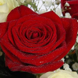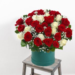 Dans ce bouquet, nous découvrons un mélange de délicatesse, de tendresse, d’amour et de sincérité. Ces sentiments passionnés se dégagent de l’alliance harmonieuse entre les roses rouges et blanches, sublimées par la légèreté du gypsophile.