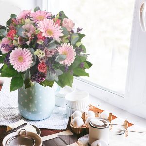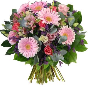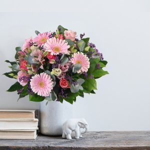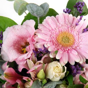 Offrez-vous un peu de douceur pour affronter la rentrée avec ce magnifique bouquet dans les tons rose pâle et parme. Composé de germinis, de roses, d’alstroemerias et autres fleurettes de saison, il apportera une touche de fraîcheur à votre intérieur.
