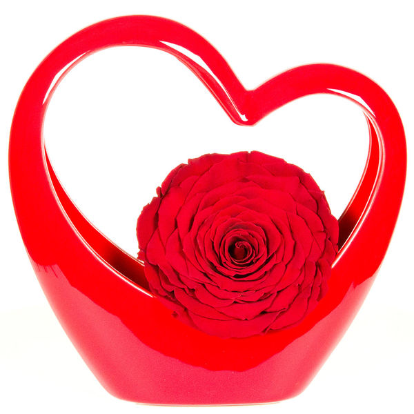 Rose stabilisée rouge (10cm de diamètre) dans son mini cœur en céramique rouge, un cadeau qui durera longtemps pour témoigner de l’amour éternel.