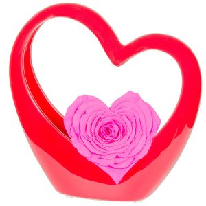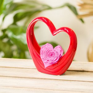 Rose stabilisée rose en forme de cœur dans son mini cœur en céramique rouge