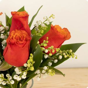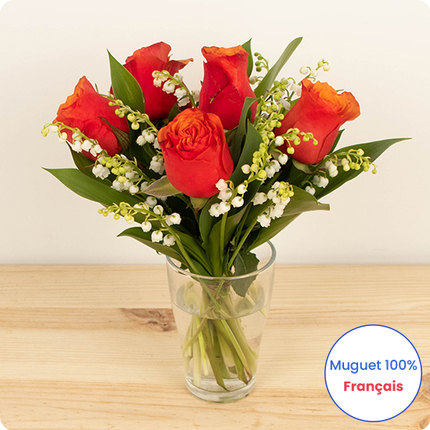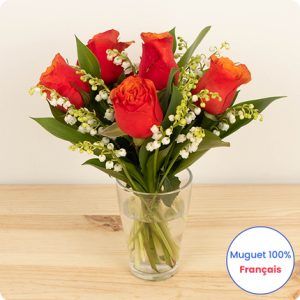 Bouquet de muguet porte bonheur qui fera battre les cœurs à la fête du muguet du 1er mai ! Ce charmant bouquet est composé de muguet en brin 100% français et de roses rouges.