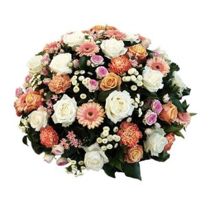 Ce sublime coussin de fleurs est une création toute en douceur, composé de roses blanches et de fleurs de saison dans les tons roses et pêches, agrémentées d’un léger feuillage. Une façon délicate et sincère de témoigner vos condoléances. La taille approximative de ce coussin est de 50 / 60 cm.
