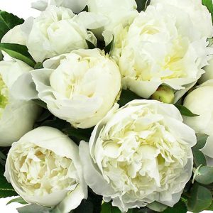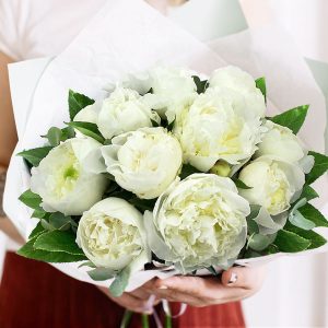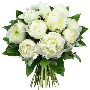 Ce bouquet de pivoines blanches est accompagné de feuillage (le nombre de fleurs peut varier en fonction du fleuriste et de la saison) pour une composition équilibrée et harmonieuse. Offrez-le en toute simplicité à l’être cher, pour lui témoigner votre affection et votre amour.