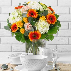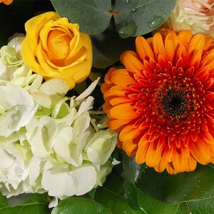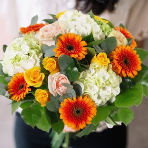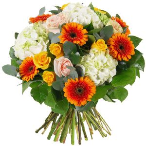 Composé de germinis, de roses et d’hortensias, ce bouquet est accompagné de feuillage pour une touche de verdure. Il vous rappellera la douceur de cette nuit d’été si éphémère.