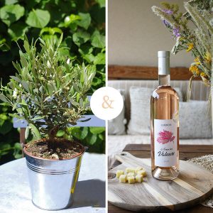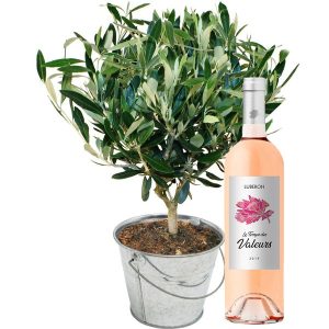 Un olivier de 35cm de hauteur dans son pot en zinc rond de 14cm, accompagné de sa bouteille de vin rosé Le Temps des Valeurs AOC Luberon 2015 de 75cl (appellation d’origine contrôlée. Issu de 2 cépages : 80% Grenache Noir , 20% Syrah).